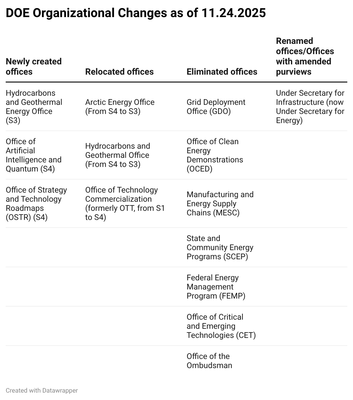 On November 24, the Department of Energy announced a sweeping restructuring effort to “Strengthen Efficiency and Unleash American Energy,” framed as an attempt to “strengthen DOE’s ability to execute President Trump’s bold agenda to restore American energy dominance.” In a follow-up statement, Wright explained that the department was aligning itself to “restore common sense to energy policy.”