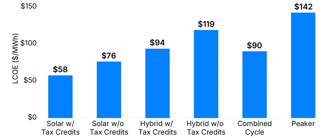 Beyond these environmental costs, the pure economics are straightforward: solar energy is cheaper than gas. As shown in the graph below, the research firm Orennia compares the levelized cost of electricity—a metric that allows for apples-to-apples comparisons between different energy sources. Even without tax credits, utility-scale solar now undercuts combined-cycle natural gas. In other words, resistance to renewable energy is a political choice that pads private, corporate fossil fuel interests, rather than reducing environmental and economic costs for consumers. And, in the context of rising electricity demand due to data centers, these political choices cannot be understood as anything but grievance-driven.
